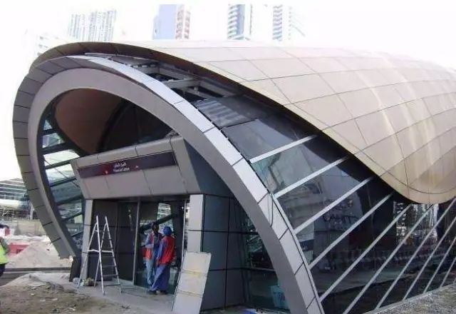 鋁板幕墻所采用的優質鋁強度高,且由于開口處采用焊接工藝,大大提高了鋁板的鋼度,確保了幕墻的抗風、防震、防雨水滲漏、防空氣滲透、防雷、抗沖擊效果。鋁單板可加工成不同規格的平板、雙曲面板、異形板等各種復雜形狀,鈑金成形后,經過表面處理,可進行氟碳噴涂、丙稀酸噴涂及粉末噴涂,色彩可任意選定,廣泛用于室內外裝飾。
