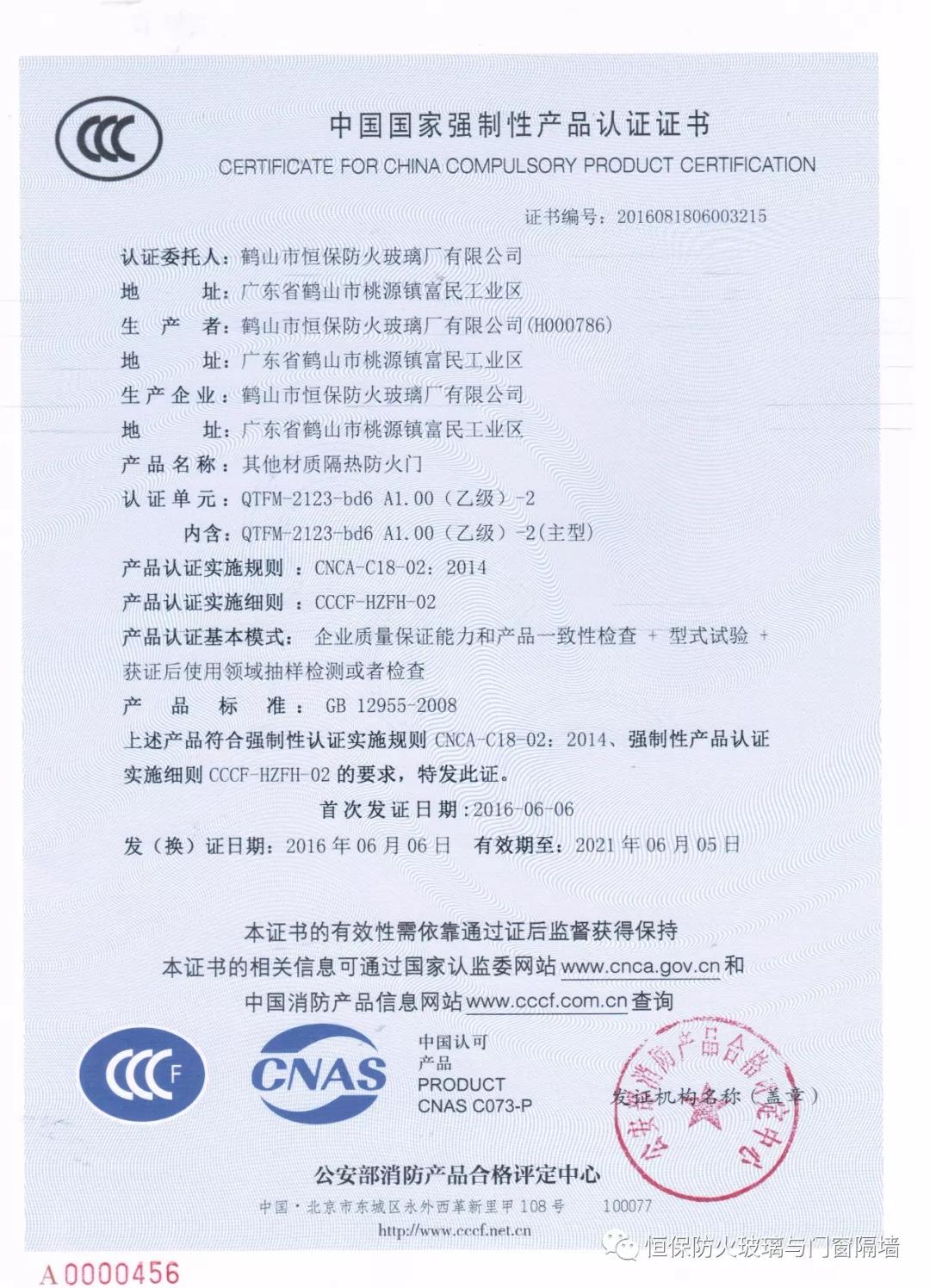 5、恒保公司一共6個產品獲得國家3C認證證書,其中大版面玻璃防火門2100mmX3000mm;