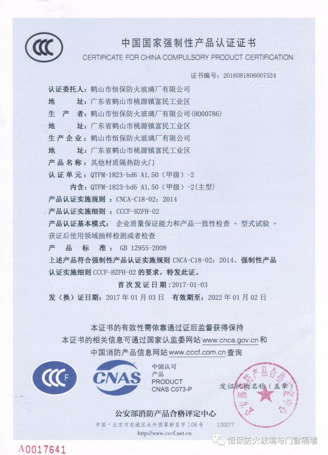 2)防火窗、防火門、防火玻璃非承重隔墻、擋煙垂壁等列入國家強制性認證產品名錄的:需有CCC認證證書和型式試驗報告;